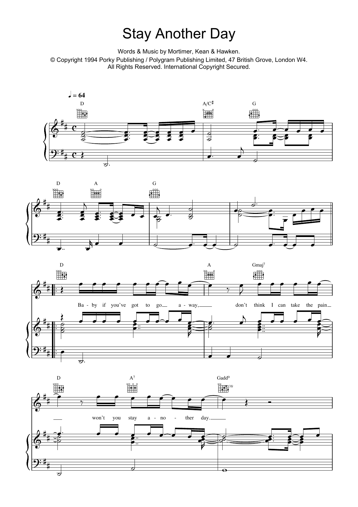 Download or print East 17 Stay Another Day sheet music, chords and digital score arranged for Really Easy Piano. This Pop score includes 3 page(s).