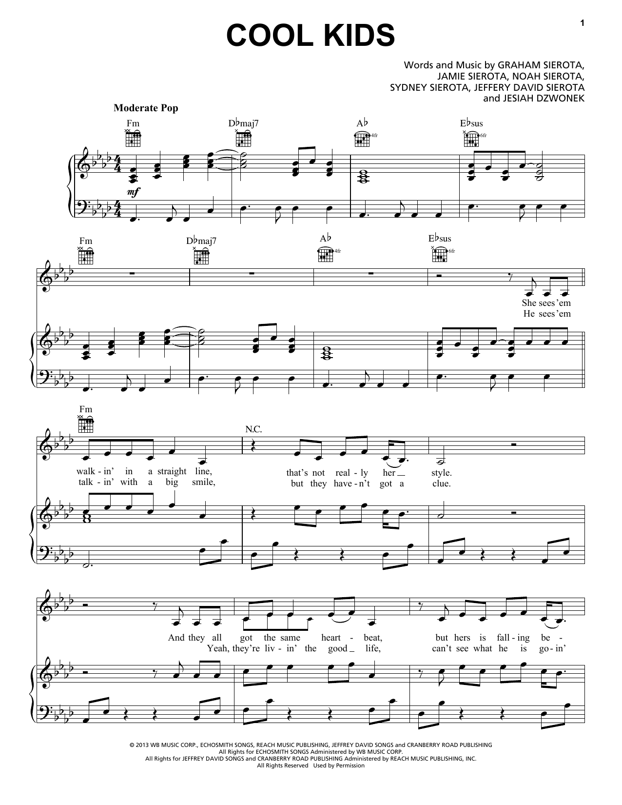 Download or print Echosmith Cool Kids sheet music, chords and digital score arranged for Easy Piano. This Pop score includes 5 page(s).