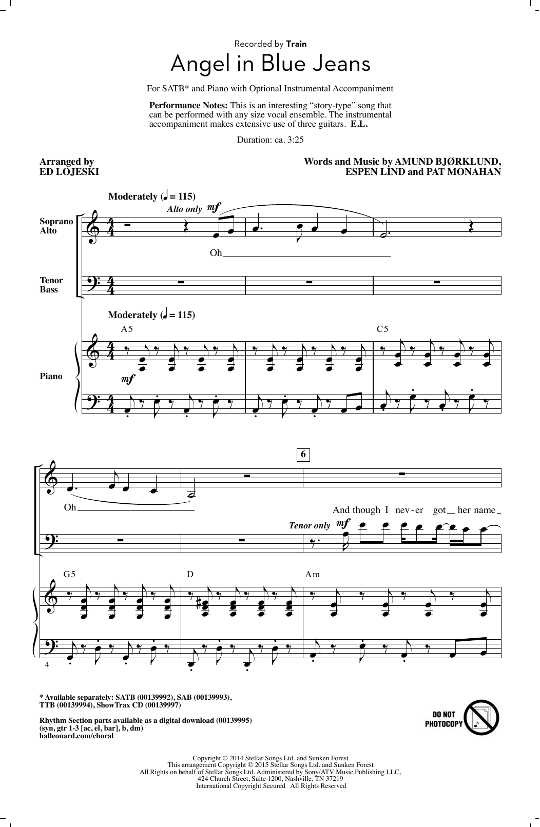 Download or print Ed Lojeski Angel In Blue Jeans sheet music, chords and digital score arranged for SATB Choir. This Pop score includes 11 page(s).