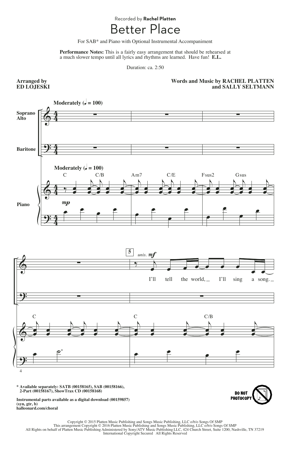 Download or print Rachel Platten Better Place (arr. Ed Lojeski) sheet music, chords and digital score arranged for SATB Choir. This Pop score includes 9 page(s).