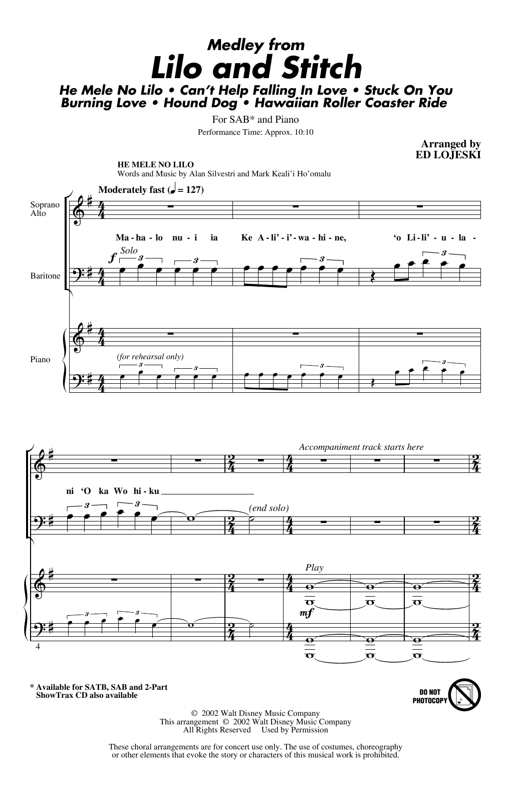 Download or print Ed Lojeski Lilo And Stitch (Medley) sheet music, chords and digital score arranged for SAB Choir. This Disney score includes 39 page(s).