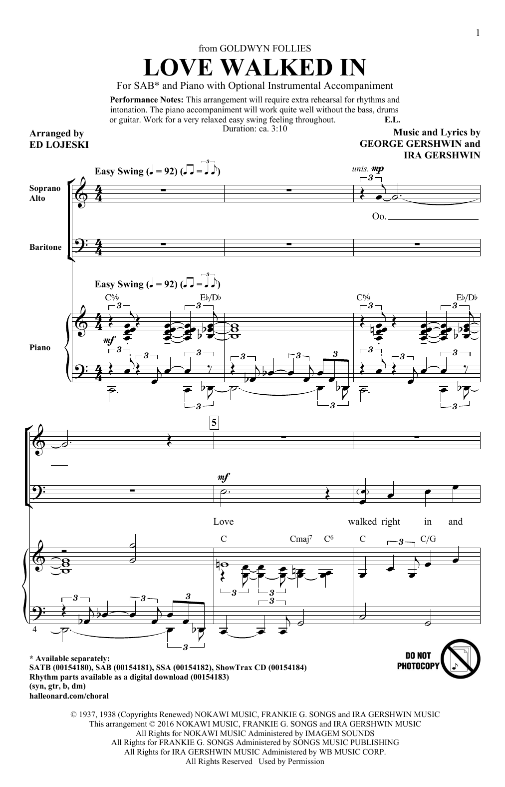 Download or print Ed Lojeski Love Walked In sheet music, chords and digital score arranged for SSA Choir. This Jazz score includes 9 page(s).