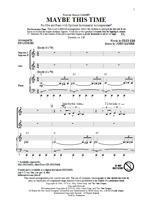 Download or print Kander & Ebb Maybe This Time (arr. Ed Lojeski) sheet music, chords and digital score arranged for SSA Choir. This Jazz score includes 7 page(s).