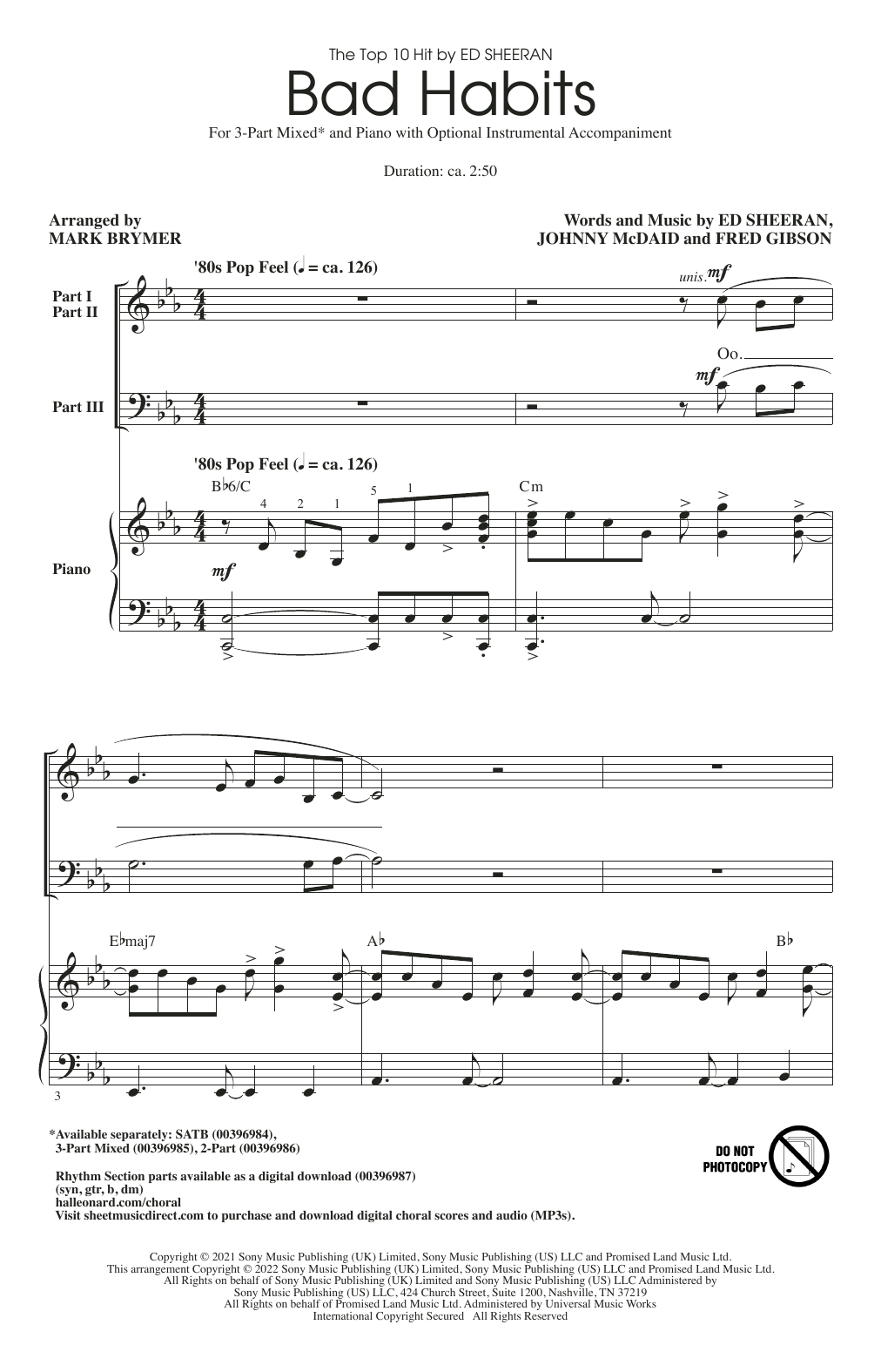 Download or print Ed Sheeran Bad Habits (arr. Mark Brymer) sheet music, chords and digital score arranged for 3-Part Mixed Choir. This Pop score includes 10 page(s).