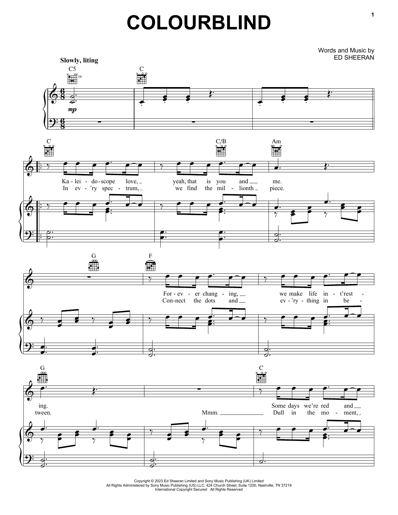 Download or print Ed Sheeran Colourblind sheet music, chords and digital score arranged for Piano, Vocal & Guitar Chords (Right-Hand Melody). This Pop score includes 4 page(s).
