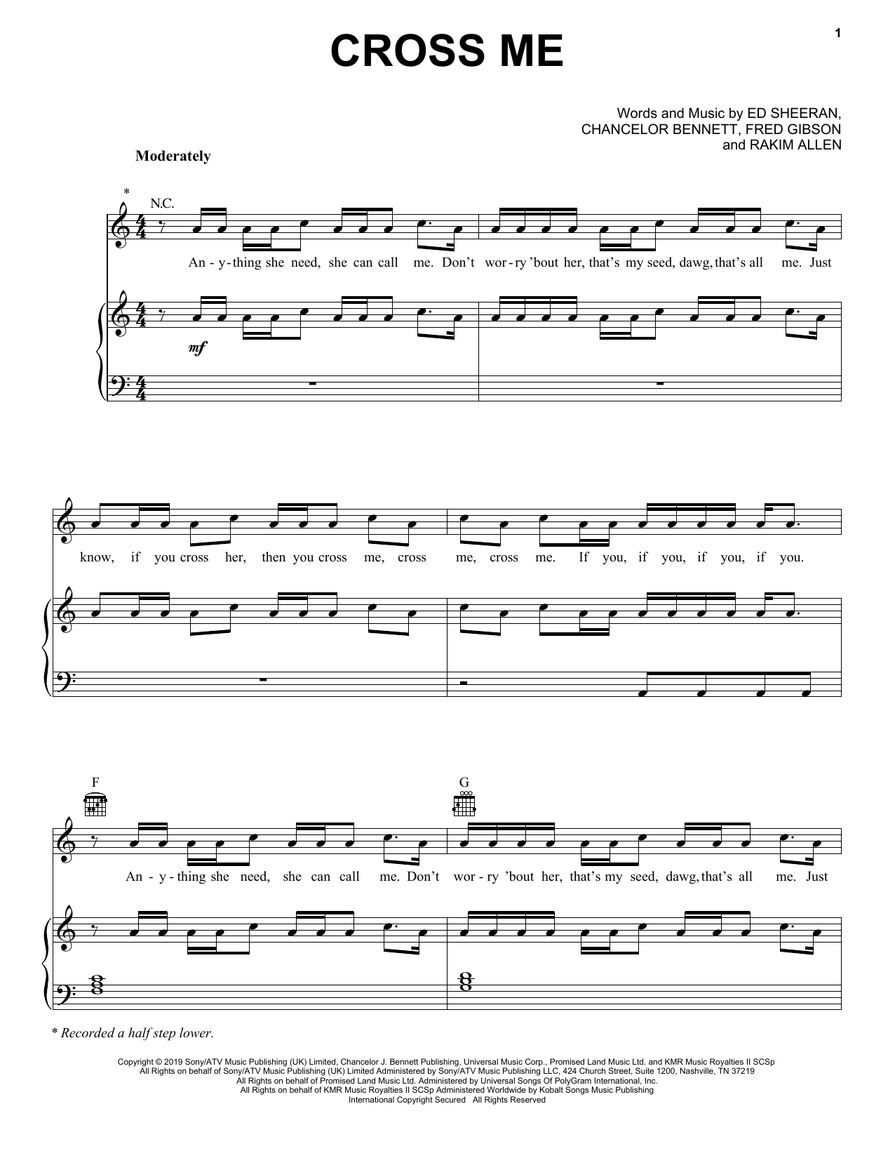 Download or print Ed Sheeran Cross Me (feat. Chance the Rapper & PnB Rock) sheet music, chords and digital score arranged for Piano, Vocal & Guitar Chords (Right-Hand Melody). This Pop score includes 10 page(s).