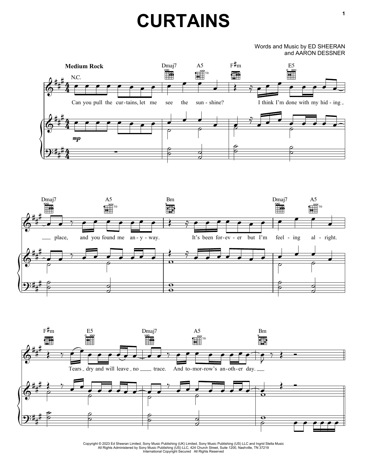Download or print Ed Sheeran Curtains sheet music, chords and digital score arranged for Piano, Vocal & Guitar Chords (Right-Hand Melody). This Pop score includes 5 page(s).