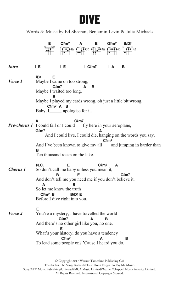 Download or print Ed Sheeran Dive sheet music, chords and digital score arranged for Really Easy Piano. This Pop score includes 3 page(s).