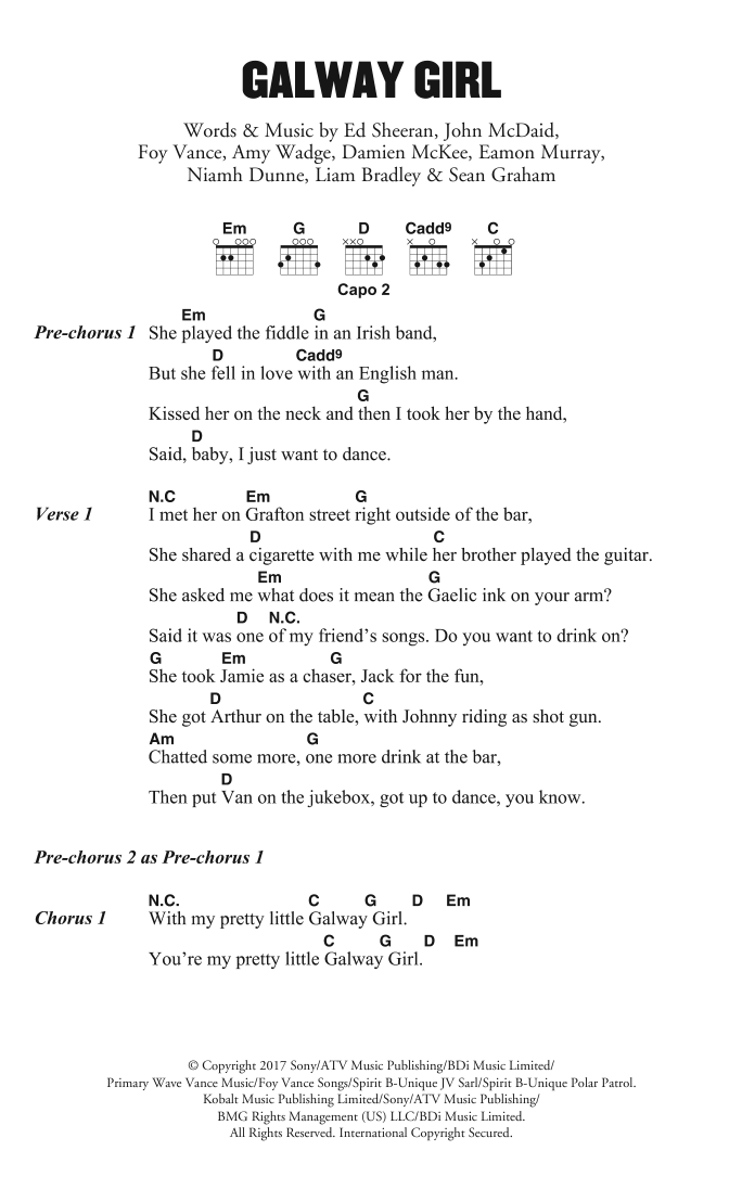 Download or print Ed Sheeran Galway Girl sheet music, chords and digital score arranged for Really Easy Piano. This Pop score includes 4 page(s).