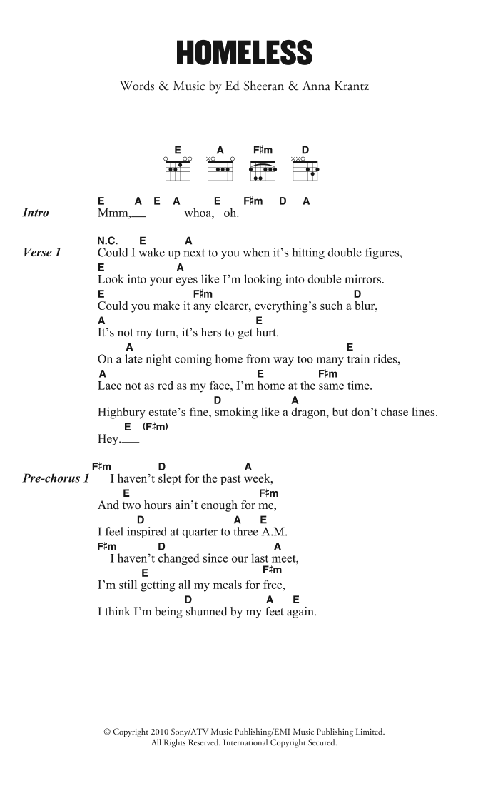 Download or print Ed Sheeran Homeless sheet music, chords and digital score arranged for Guitar Chords/Lyrics. This Pop score includes 3 page(s).