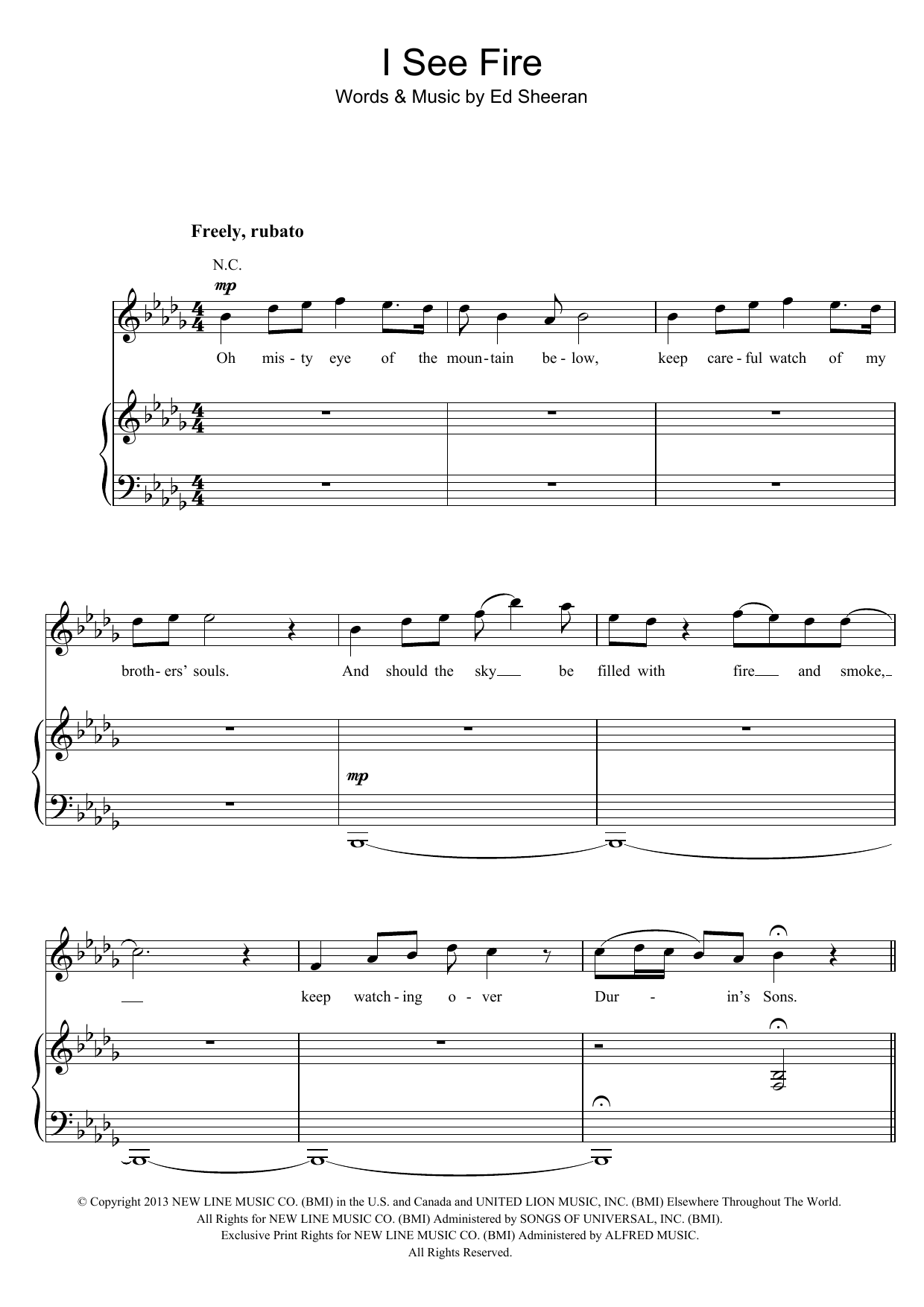 Download or print Ed Sheeran I See Fire (from The Hobbit) sheet music, chords and digital score arranged for Really Easy Piano. This Pop score includes 2 page(s).