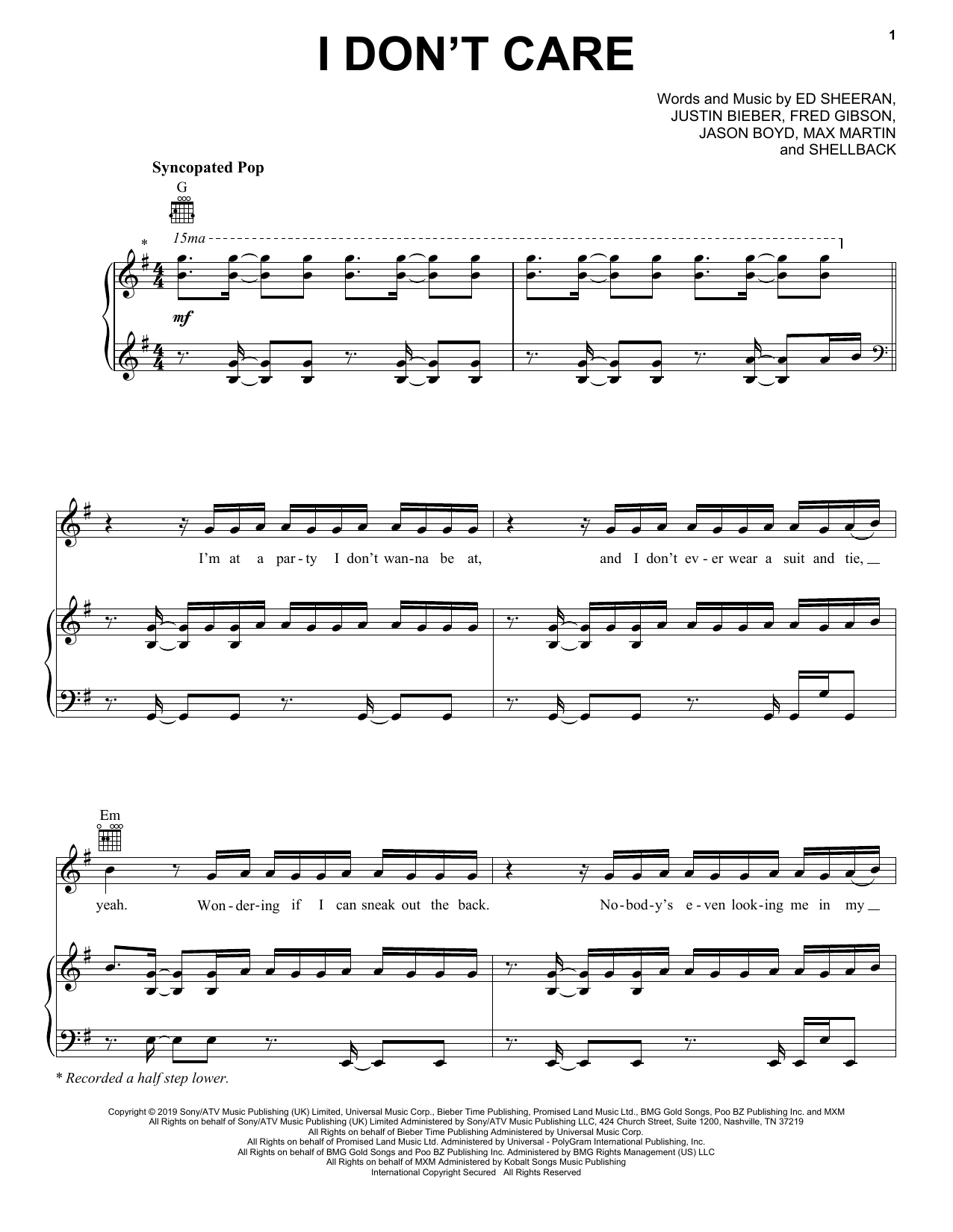 Download or print Ed Sheeran & Justin Bieber I Don't Care sheet music, chords and digital score arranged for Violin Solo. This Pop score includes 2 page(s).