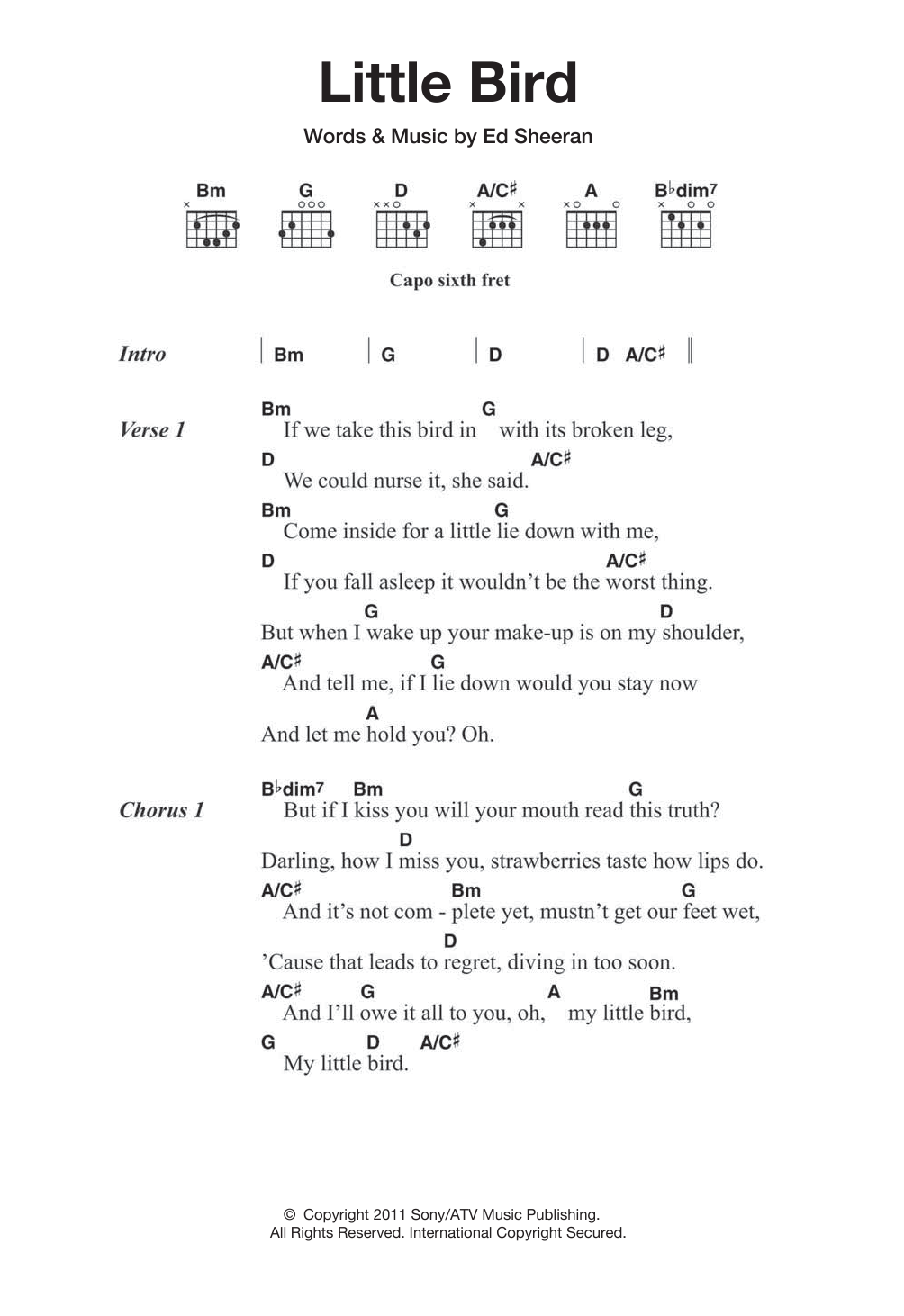 Download or print Ed Sheeran Little Bird sheet music, chords and digital score arranged for Guitar Chords/Lyrics. This Pop score includes 3 page(s).