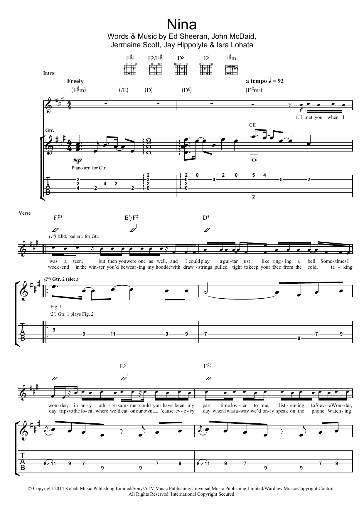 Download or print Ed Sheeran Nina sheet music, chords and digital score arranged for Guitar Tab. This Pop score includes 6 page(s).