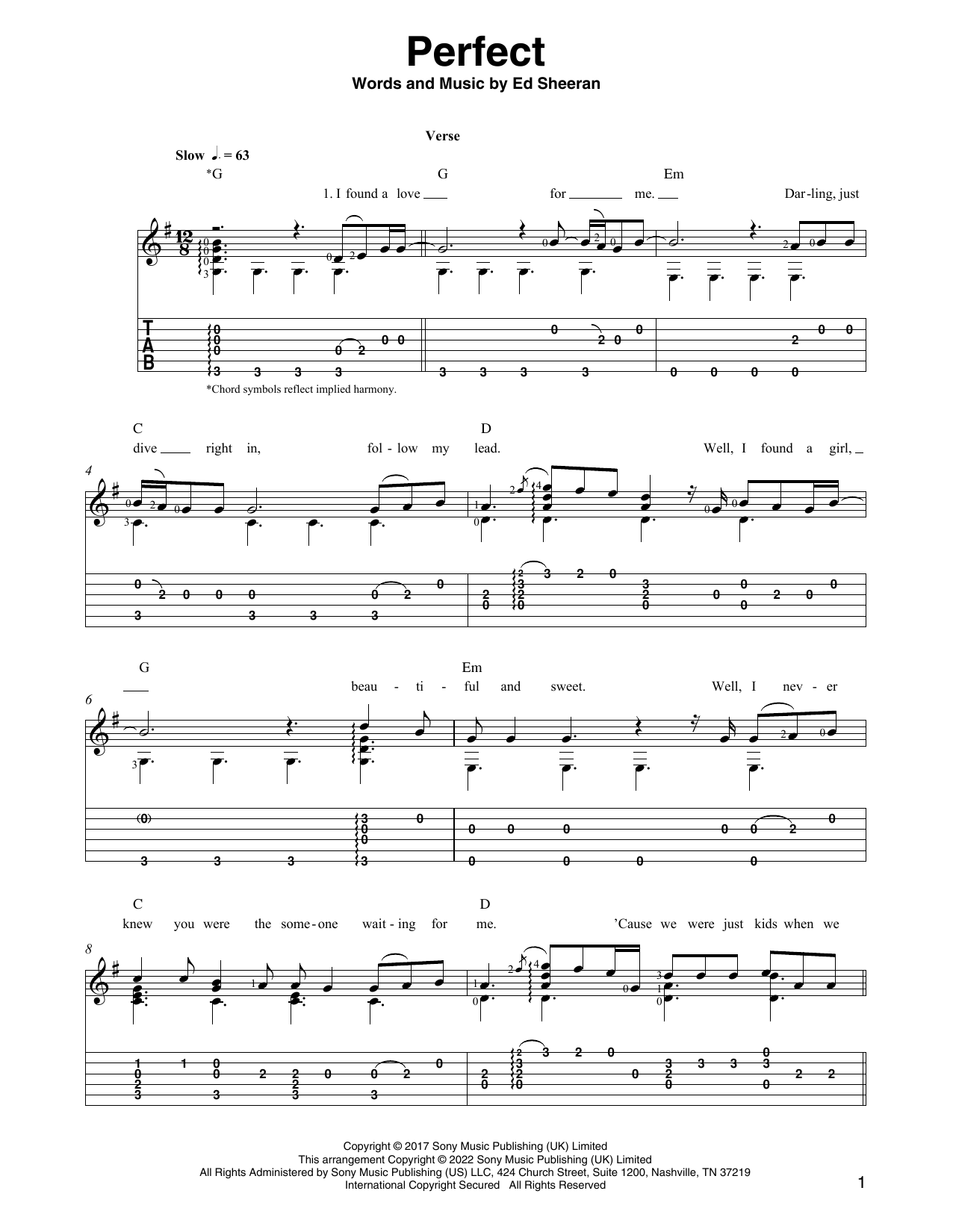 Download or print Ed Sheeran Perfect (arr. Ben Pila) sheet music, chords and digital score arranged for Solo Guitar. This Pop score includes 6 page(s).