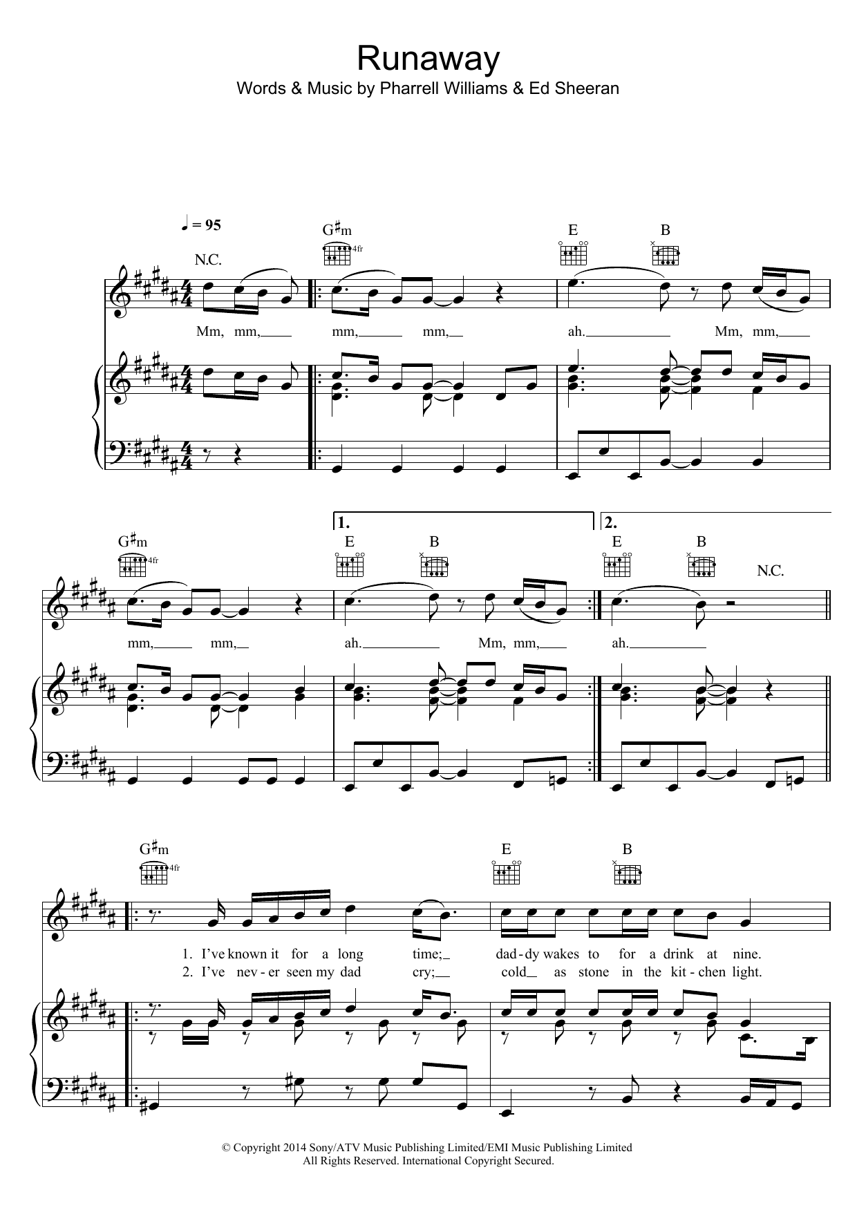 Download or print Ed Sheeran Runaway sheet music, chords and digital score arranged for Piano, Vocal & Guitar Chords. This Pop score includes 6 page(s).