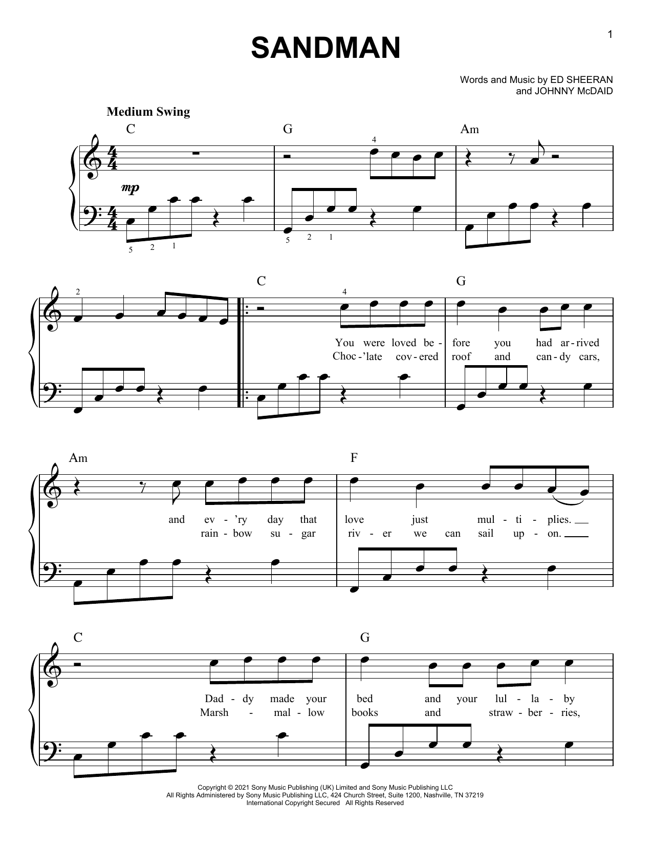 Download or print Ed Sheeran Sandman sheet music, chords and digital score arranged for Piano, Vocal & Guitar Chords (Right-Hand Melody). This Pop score includes 7 page(s).