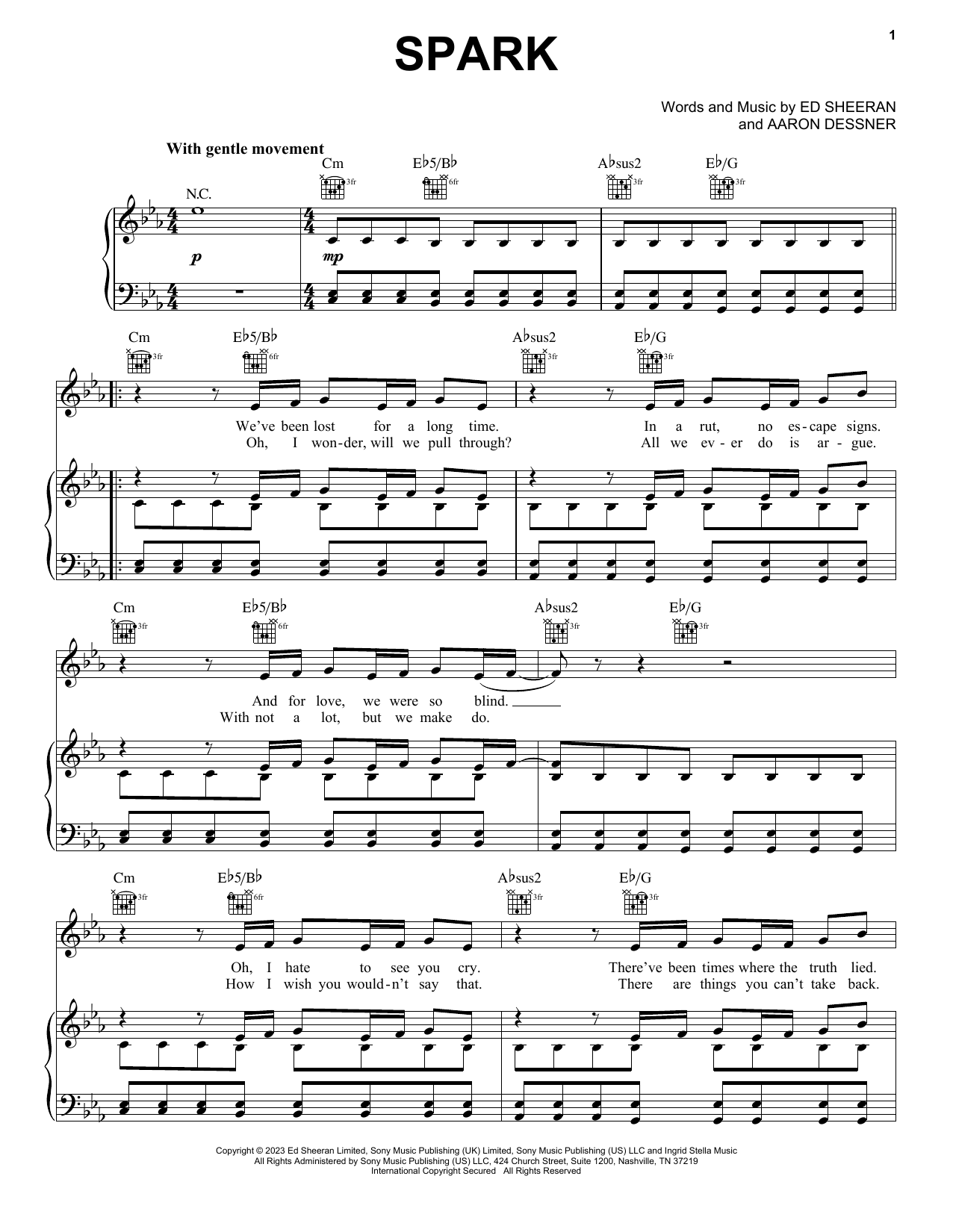 Download or print Ed Sheeran Spark sheet music, chords and digital score arranged for Piano, Vocal & Guitar Chords (Right-Hand Melody). This Pop score includes 4 page(s).