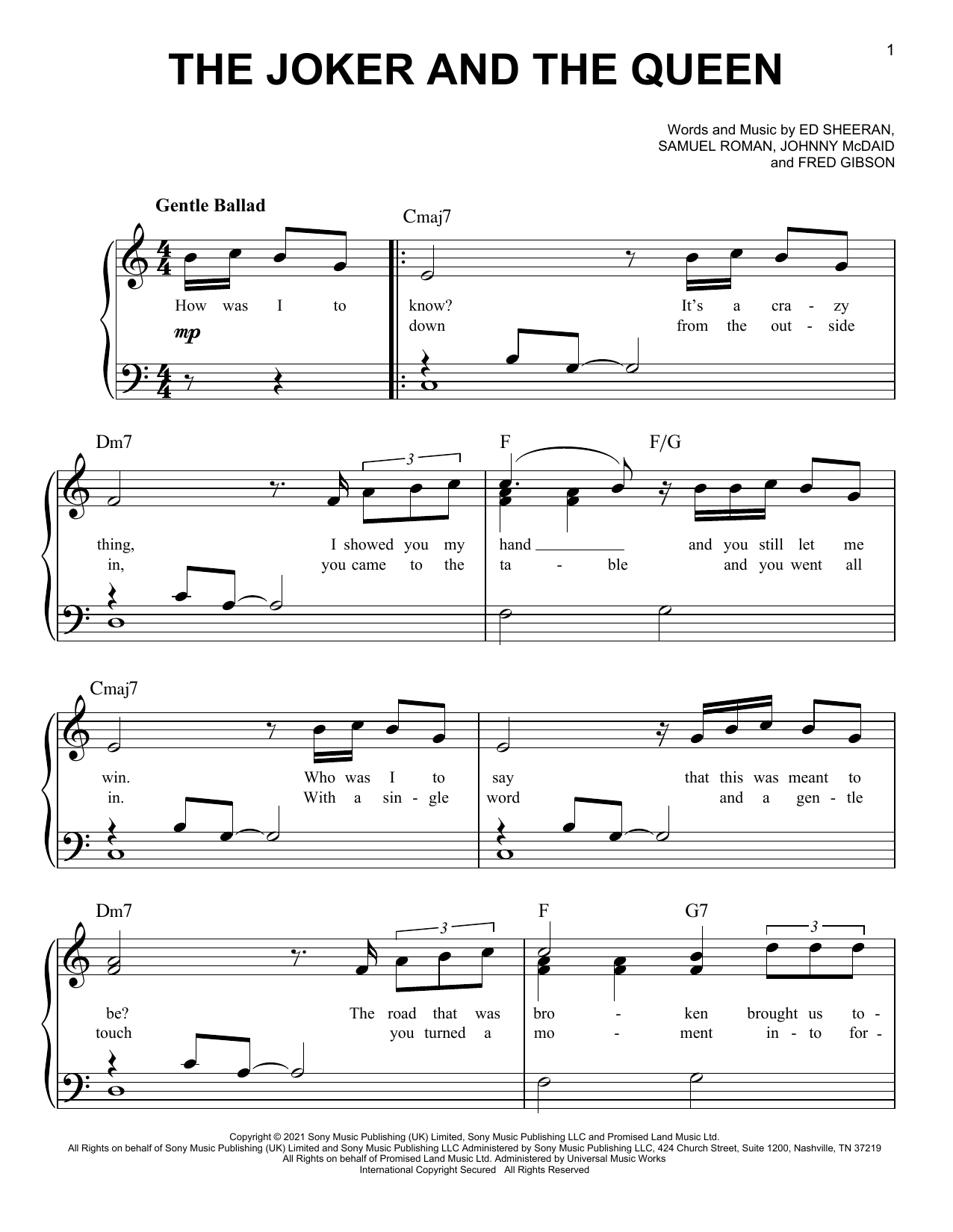 Download or print Ed Sheeran The Joker And The Queen sheet music, chords and digital score arranged for Piano, Vocal & Guitar Chords (Right-Hand Melody). This Pop score includes 3 page(s).