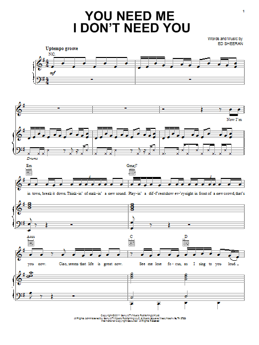 Download or print Ed Sheeran You Need Me I Don't Need You sheet music, chords and digital score arranged for Piano, Vocal & Guitar Chords. This Pop score includes 8 page(s).