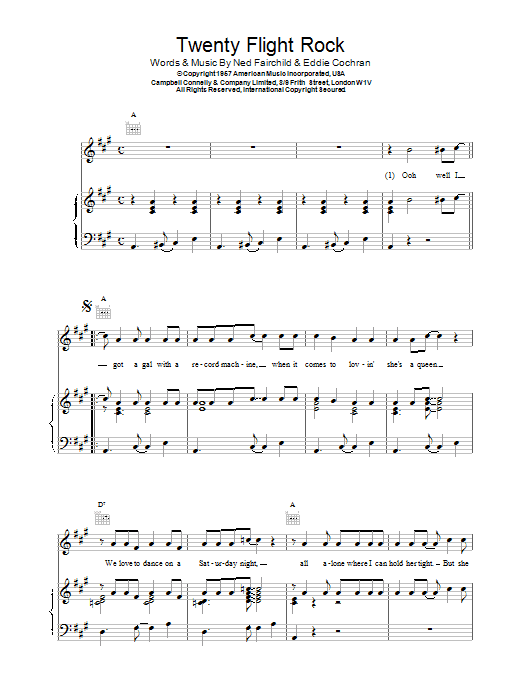 Download or print Eddie Cochran Twenty Flight Rock sheet music, chords and digital score arranged for Piano, Vocal & Guitar Chords. This Pop score includes 3 page(s).