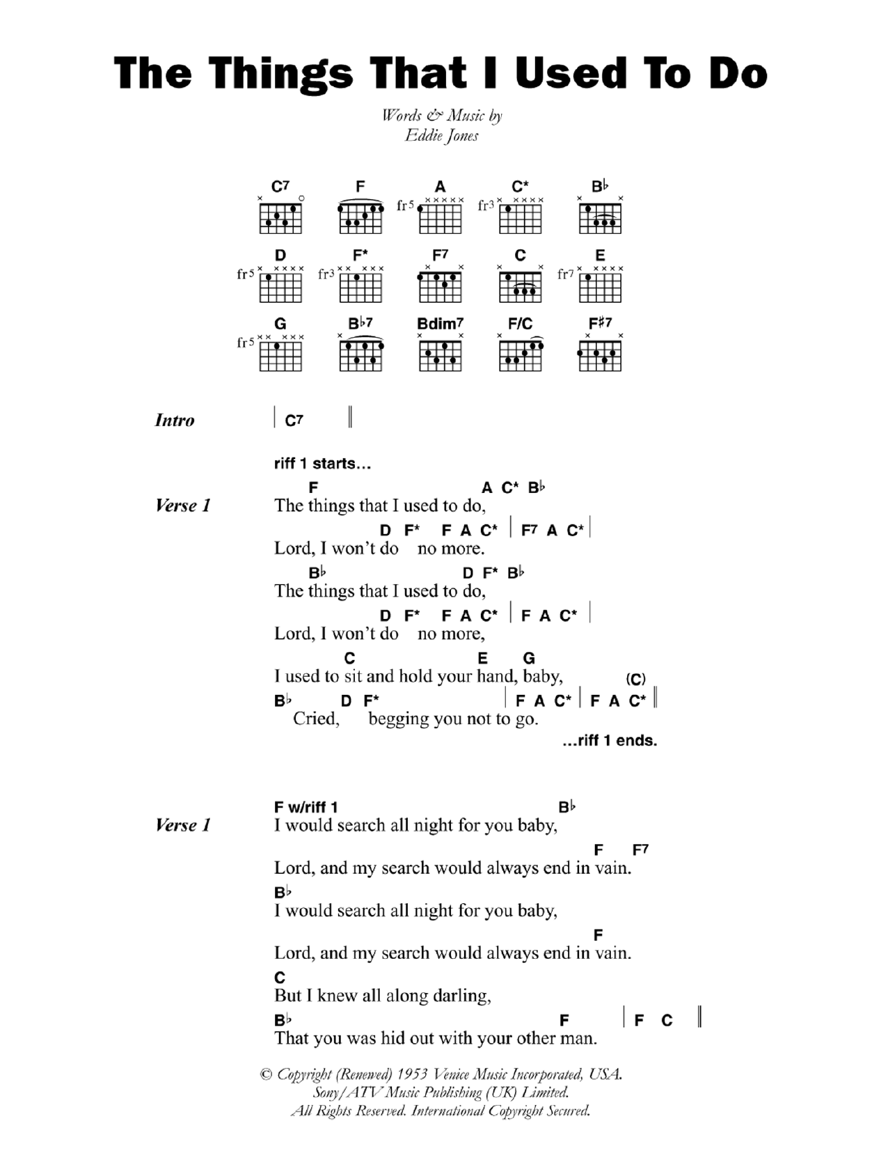 Download or print Eddie "Guitar Slim" Jones The Things That I Used To Do sheet music, chords and digital score arranged for Guitar Tab (Single Guitar). This Blues score includes 6 page(s).