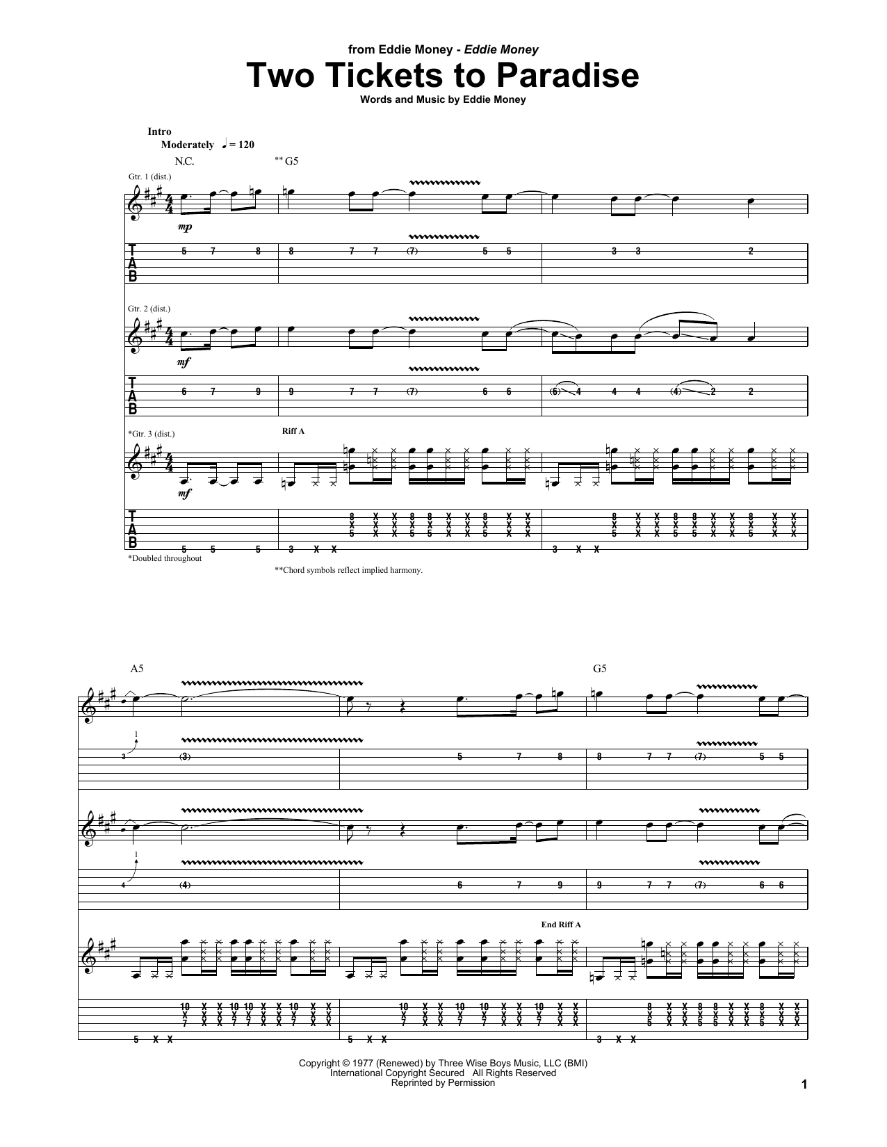 Download or print Eddie Money Two Tickets To Paradise sheet music, chords and digital score arranged for Guitar Chords/Lyrics. This Pop score includes 2 page(s).