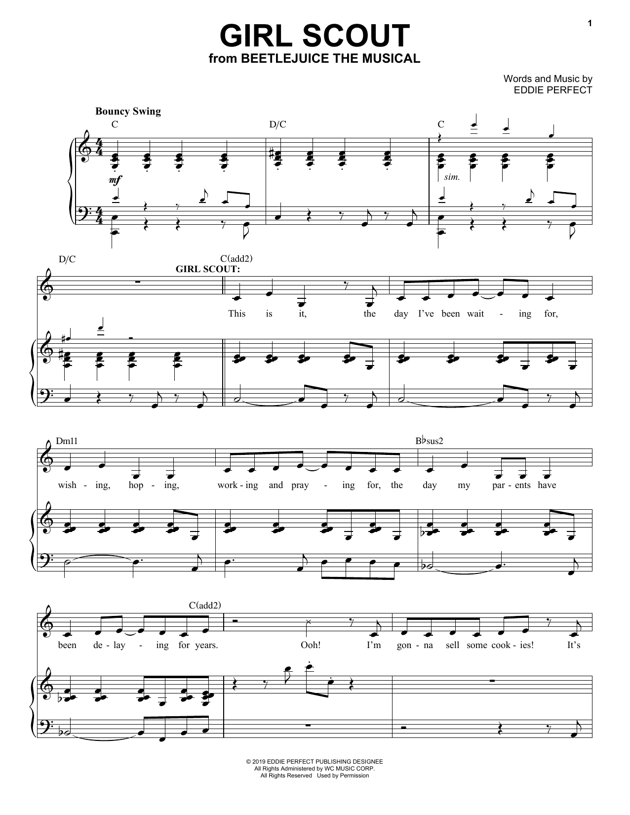 Download or print Eddie Perfect Girl Scout (from Beetlejuice The Musical) sheet music, chords and digital score arranged for Piano & Vocal. This Broadway score includes 7 page(s).