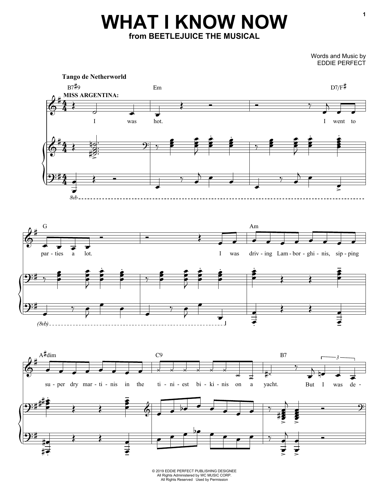 Download or print Eddie Perfect What I Know Now (from Beetlejuice The Musical) sheet music, chords and digital score arranged for Piano & Vocal. This Broadway score includes 12 page(s).