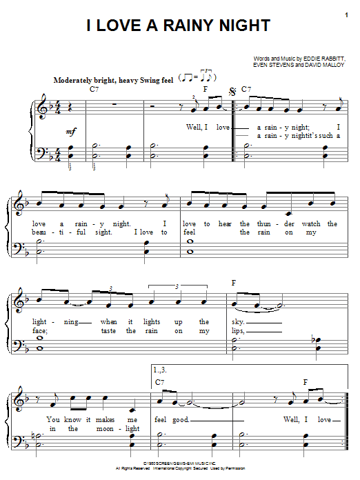 Download or print Eddie Rabbitt I Love A Rainy Night sheet music, chords and digital score arranged for Piano, Vocal & Guitar Chords (Right-Hand Melody). This Pop score includes 5 page(s).