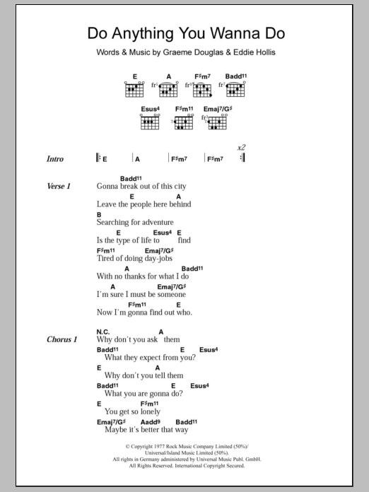 Download or print Eddie & The Hotrods Do Anything You Wanna Do sheet music, chords and digital score arranged for Guitar Chords/Lyrics. This Rock score includes 2 page(s).