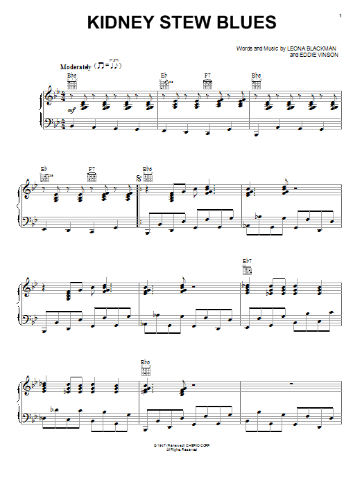 Download or print Eddie Vinson Kidney Stew Blues sheet music, chords and digital score arranged for Very Easy Piano. This Blues score includes 4 page(s).