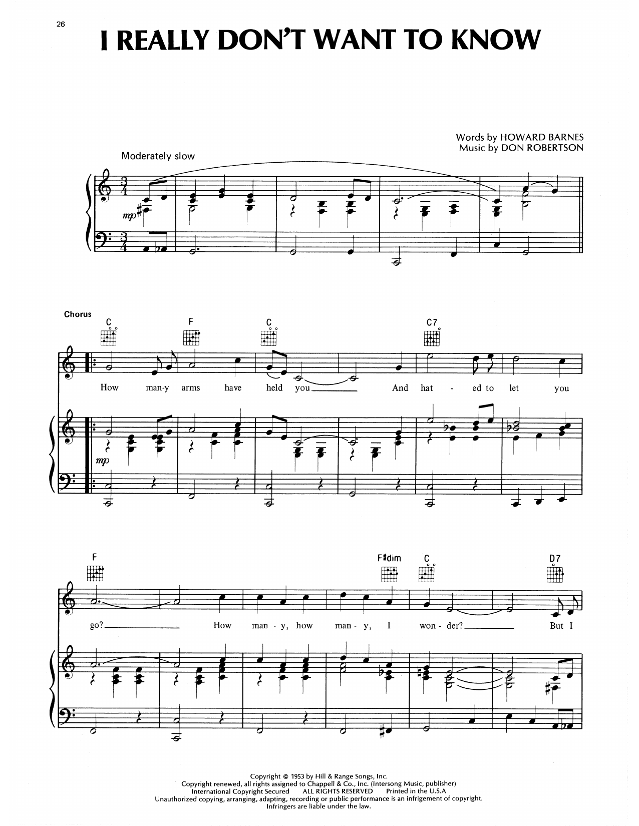 Download or print Eddy Arnold I Really Don't Want To Know sheet music, chords and digital score arranged for Piano, Vocal & Guitar Chords (Right-Hand Melody). This Country score includes 3 page(s).
