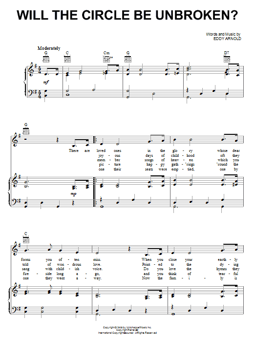 Download or print Eddy Arnold Will The Circle Be Unbroken sheet music, chords and digital score arranged for Piano, Vocal & Guitar Chords (Right-Hand Melody). This Blues score includes 2 page(s).