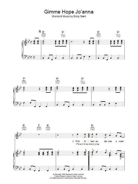 Download or print Eddy Grant Gimme Hope Jo'anna sheet music, chords and digital score arranged for Piano, Vocal & Guitar Chords. This Pop score includes 4 page(s).