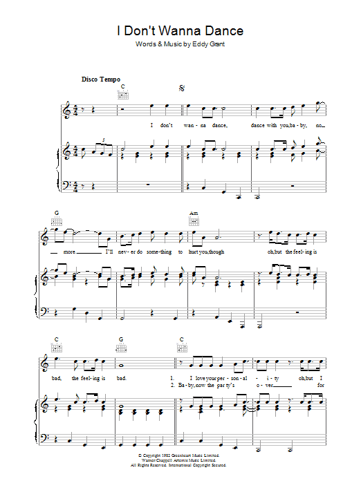 Download or print Eddy Grant I Don't Wanna Dance sheet music, chords and digital score arranged for Guitar Chords/Lyrics. This Reggae score includes 3 page(s).