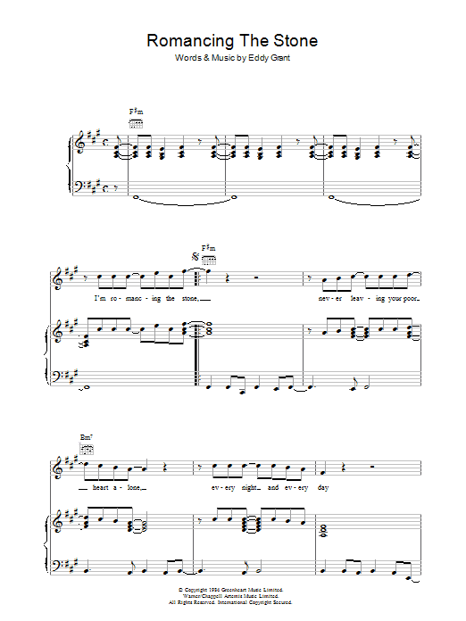 Download or print Eddy Grant Romancing The Stone sheet music, chords and digital score arranged for Piano, Vocal & Guitar Chords. This Pop score includes 6 page(s).