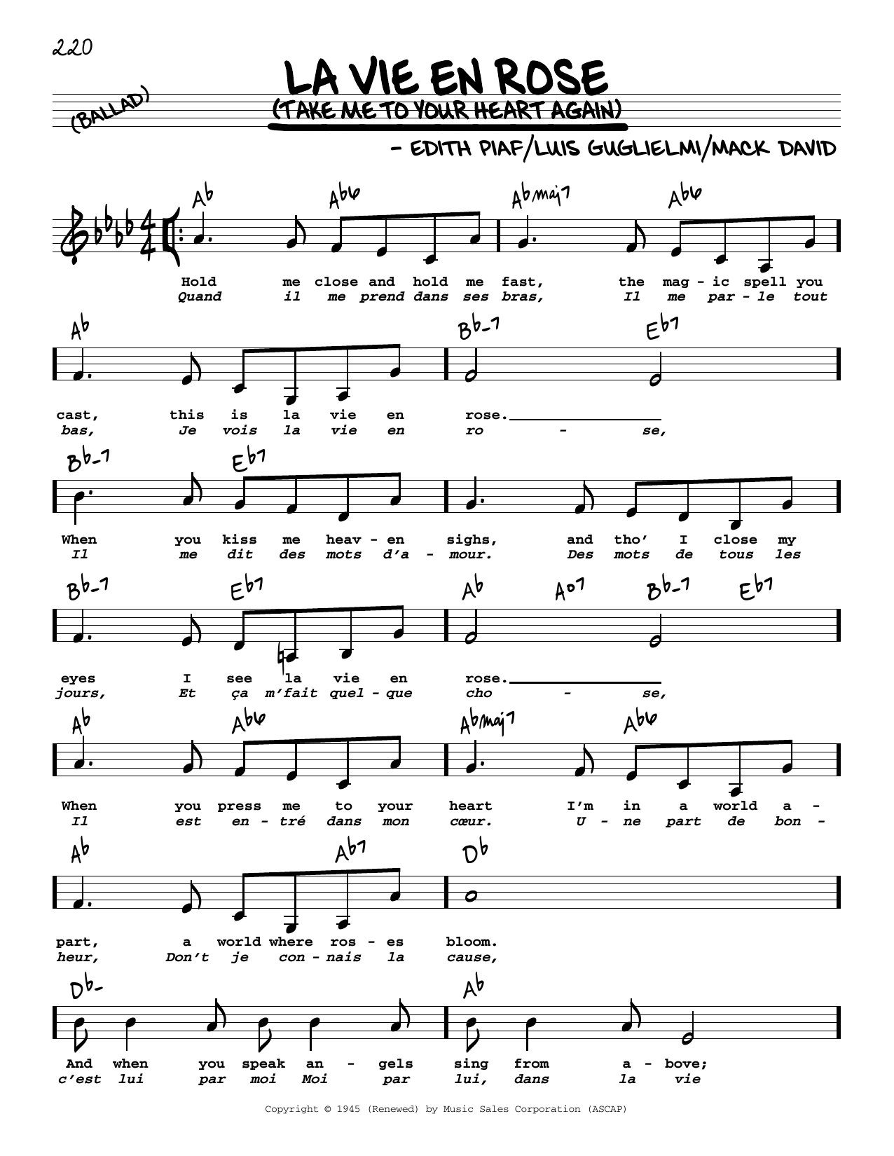 Download or print Edith Piaf La Vie En Rose (Take Me To Your Heart Again) (Low Voice) sheet music, chords and digital score arranged for Real Book – Melody, Lyrics & Chords. This Jazz score includes 2 page(s).