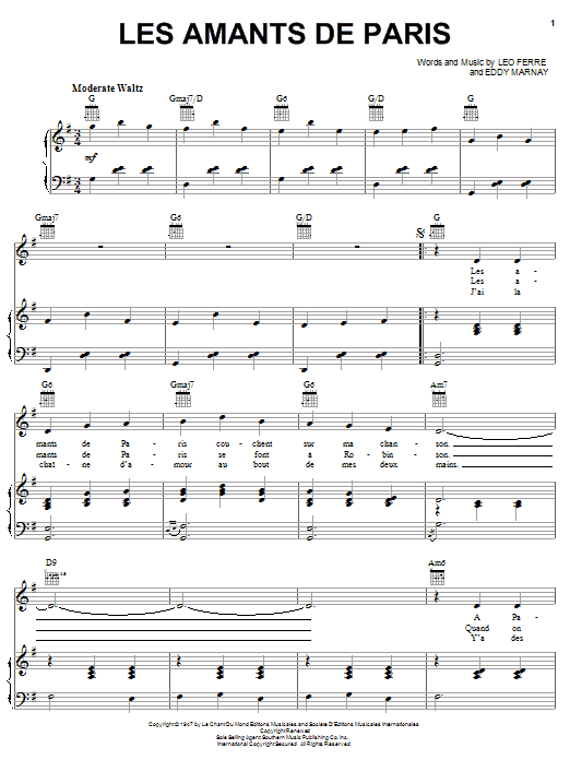 Download or print Edith Piaf Les Amants De Paris sheet music, chords and digital score arranged for Piano, Vocal & Guitar Chords (Right-Hand Melody). This French score includes 5 page(s).