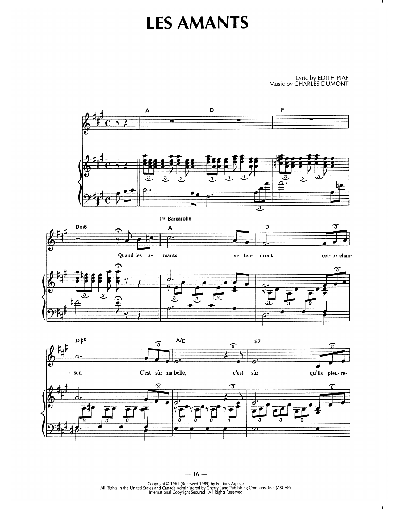 Download or print Edith Piaf Les Amants sheet music, chords and digital score arranged for Piano, Vocal & Guitar Chords (Right-Hand Melody). This French score includes 5 page(s).
