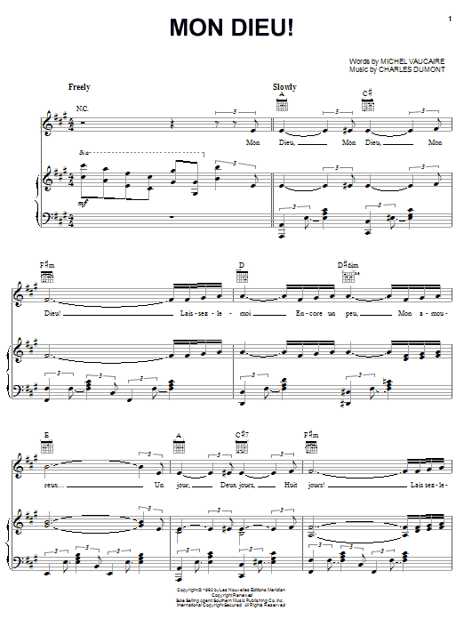Download or print Edith Piaf Mon Dieu! sheet music, chords and digital score arranged for Piano, Vocal & Guitar Chords (Right-Hand Melody). This Standards score includes 4 page(s).
