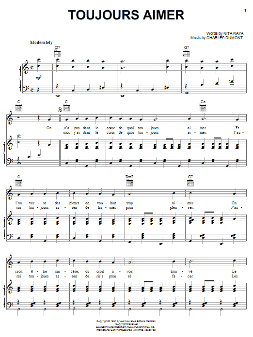 Download or print Edith Piaf Toujours Aimer sheet music, chords and digital score arranged for Piano, Vocal & Guitar Chords (Right-Hand Melody). This Standards score includes 4 page(s).