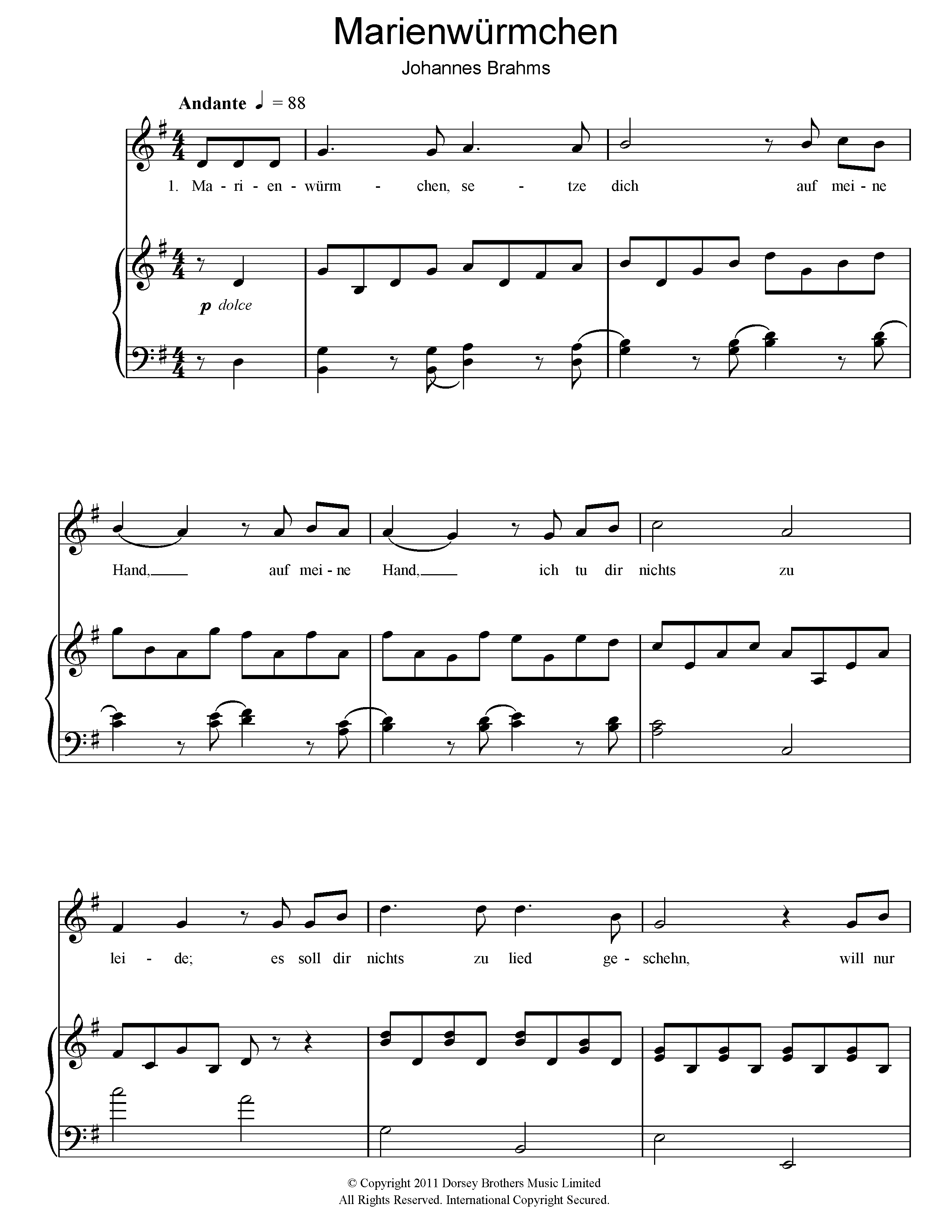 Download or print Johannes Brahms Marienwurmchen sheet music, chords and digital score arranged for Piano & Vocal. This Classical score includes 4 page(s).