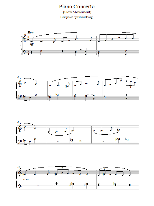 Download or print Edvard Grieg Piano Concerto in G minor (Slow Movement) sheet music, chords and digital score arranged for Piano Solo. This Classical score includes 6 page(s).