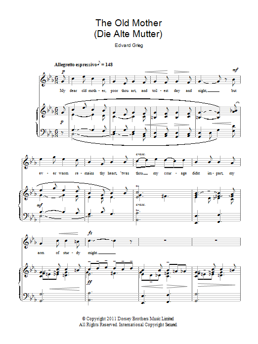 Download or print Edvard Grieg The Old Mother (Die Alte Mutter) sheet music, chords and digital score arranged for Piano & Vocal. This Classical score includes 3 page(s).