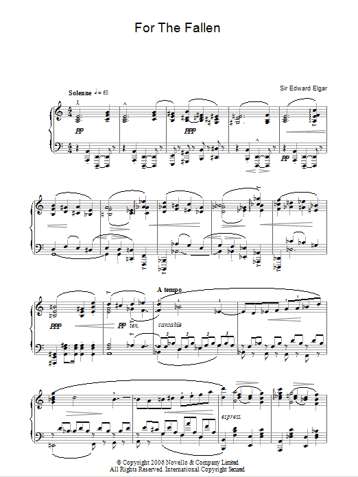 Download or print Edward Elgar For The Fallen from The Spirit Of England Op. 80 sheet music, chords and digital score arranged for Piano Solo. This Classical score includes 3 page(s).