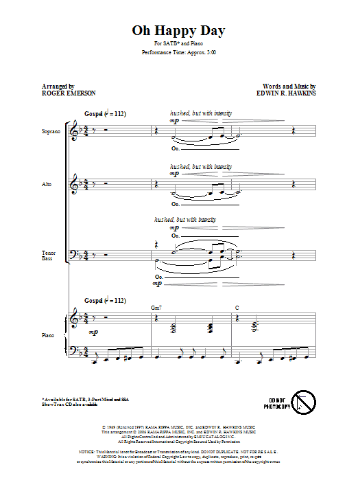 Download or print Edwin R. Hawkins Oh Happy Day (arr. Roger Emerson) sheet music, chords and digital score arranged for 3-Part Mixed Choir. This Film/TV score includes 13 page(s).