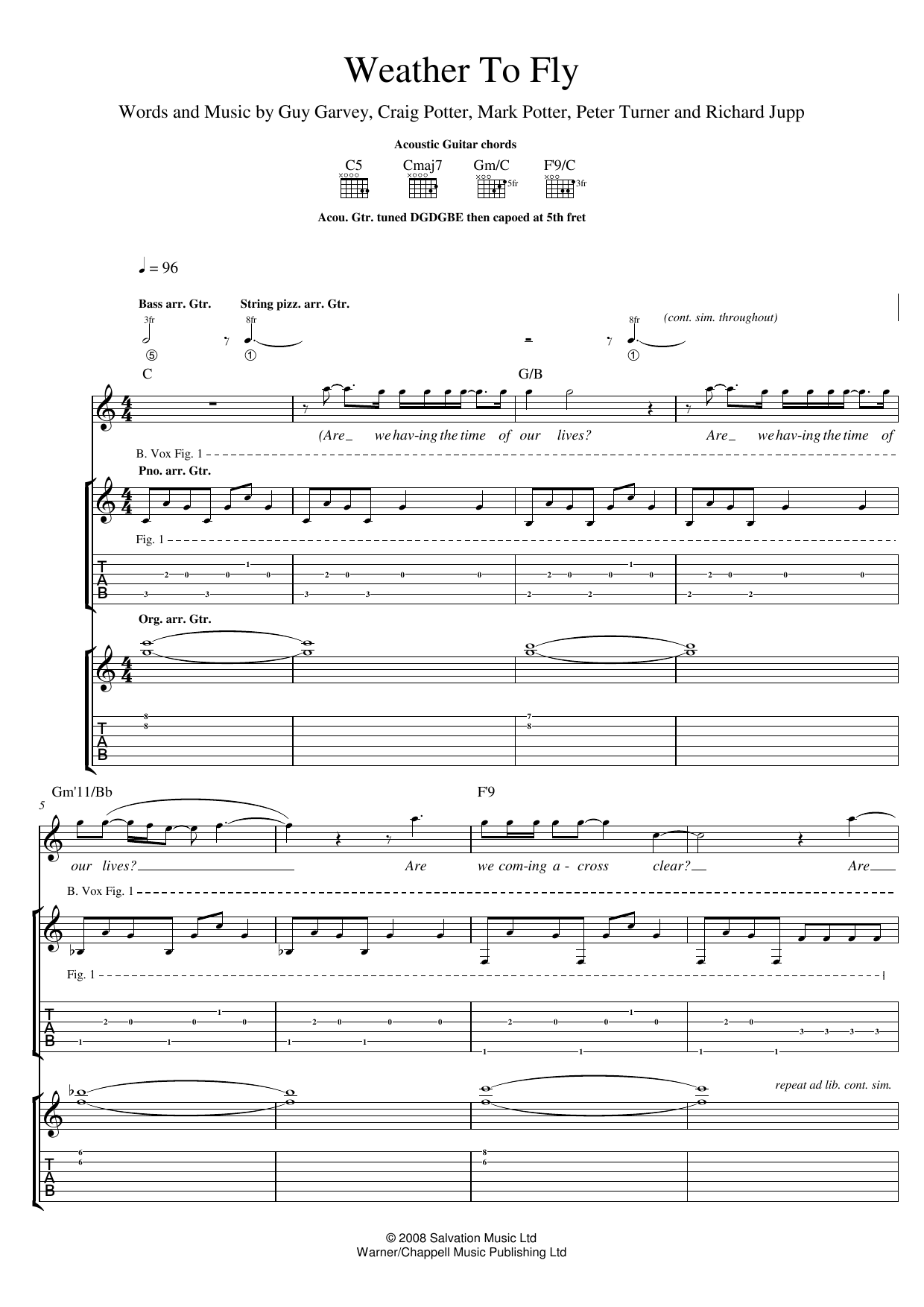 Download or print Elbow Weather To Fly sheet music, chords and digital score arranged for Guitar Tab. This Alternative score includes 4 page(s).
