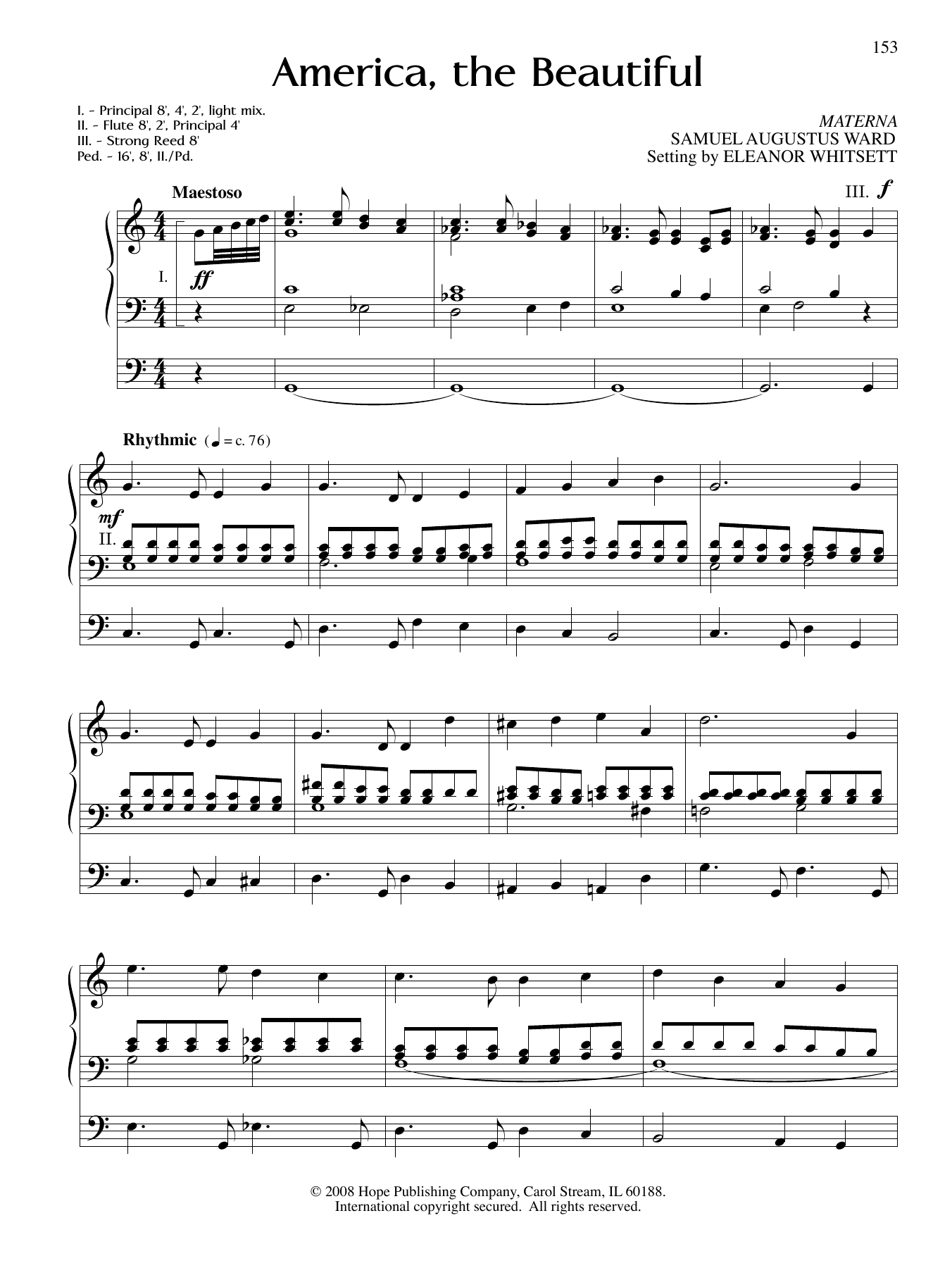 Download or print Eleanor Whitsett America, the Beautiful sheet music, chords and digital score arranged for Organ. This Hymn score includes 3 page(s).
