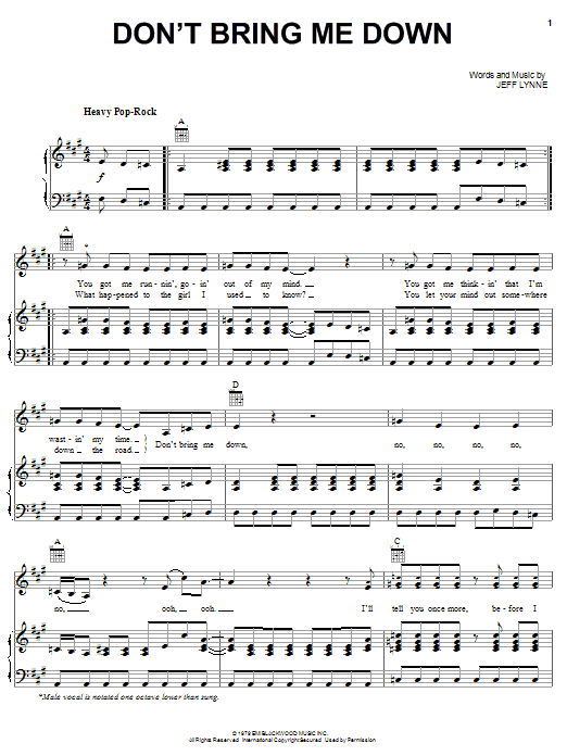 Download or print Electric Light Orchestra Don't Bring Me Down sheet music, chords and digital score arranged for Guitar Tab. This Pop score includes 7 page(s).